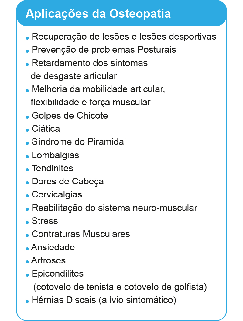 A Osteopatia é uma terapia manual não evasiva e holística, que se foca no corpo como um todo, tratando e fortalecendo a estrutura músculo-esquelética, com um efeito positivo nos sistemas nervoso, circulatório e linfático.